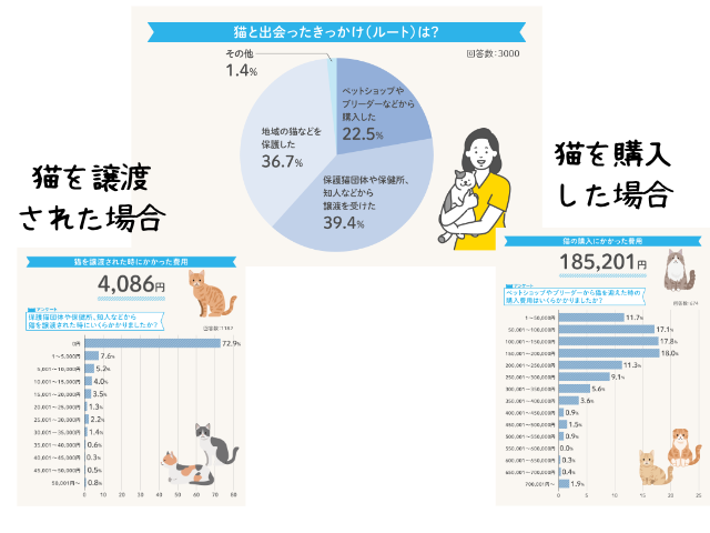 猫との出会いは、保護猫団体などからの譲渡がもっとも多く39%、一方でペットショップなどからの購入はもっとも少なく22%という結果になりました。