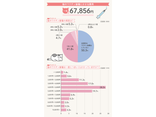 ワクチン費用は一生で約6万7千円の見込み。一度の接種でかかる費用は動物病院によって差がありますが3千円から6千円。