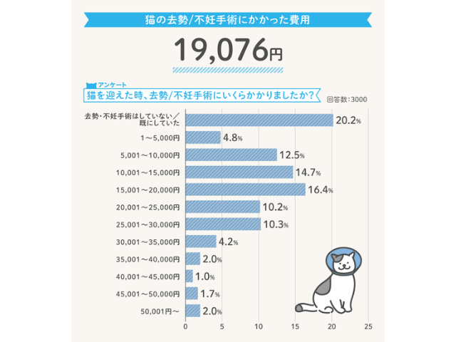 お迎えしたときにすでに手術済みだったという声が20%で割合は一番多いです。猫をお迎えしてから去勢、避妊手術した場合の費用は、2万円弱で、一番多いのは1万5千円〜2万円。
