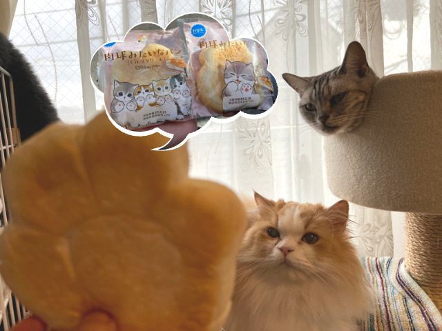 わたしもさっそく買ってきました。人気で売り切れるのか、今回は「肉球みたいなパン」をGET。うちの猫たちに見せてみたら「???」と当然の反応でした。