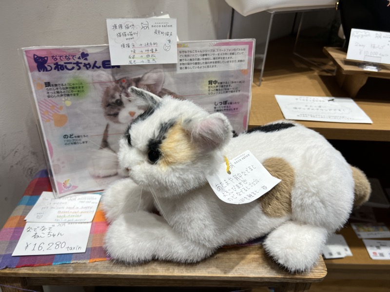 なでなでねこちゃんには、静電センサーが、頭とおなかの2か所にあり、頭を撫でると、「ミャ~オ」と鳴き、頭を触ると「ごろごろ」言うなど、コミュニケーションスキルの高いネコちゃんです。