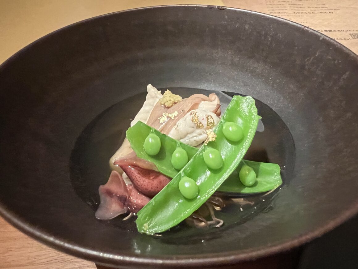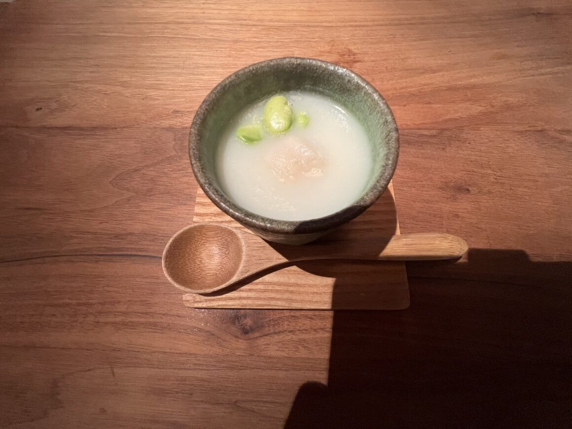 先付  新玉ねぎのポタージュ 炙りホタテとそらまめ