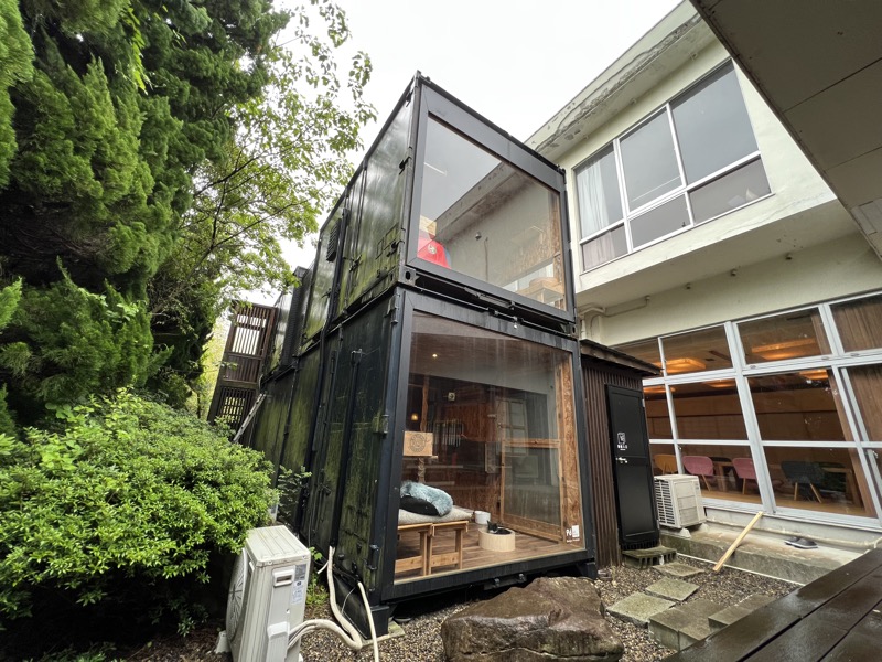 こちらは外から見た猫庭と、てしま旅館です。猫庭コンテナ正面がお食事の場所になっています。