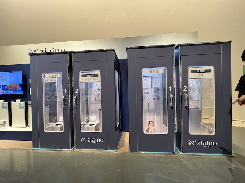 ②右のブースではペットフードをおいた部屋の臭いと、ジアイーノを作動させた部屋の臭いを比較