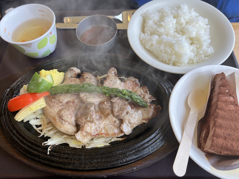 じゅうじゅうと湯気のたった鉄板焼です。これにもケーキセットをつけました。