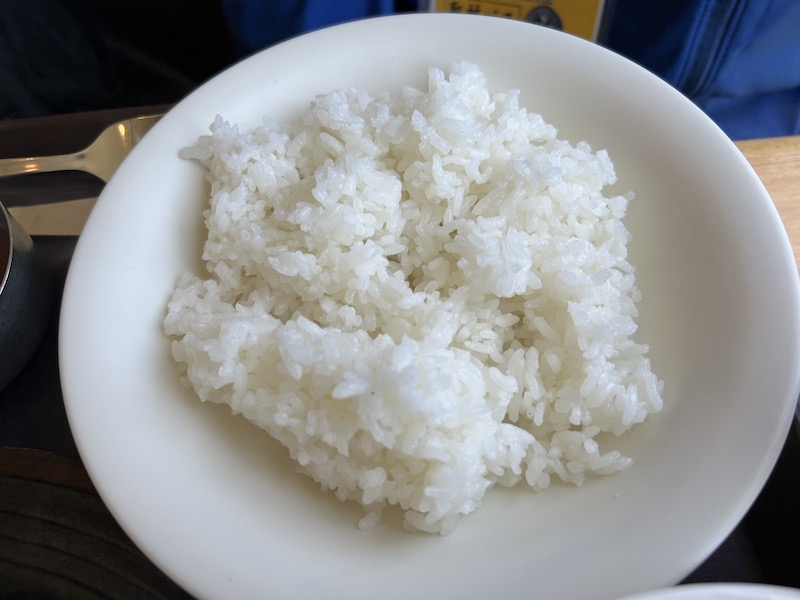 ガッツリお肉に白いご飯は欠かせません。トチブー鉄板焼には佐護ツシマヤマネコ米のごはんがどーんとついてきます。お腹ペコペコなオトナ男子、お父さんも食べ切れなそうなボリューム。