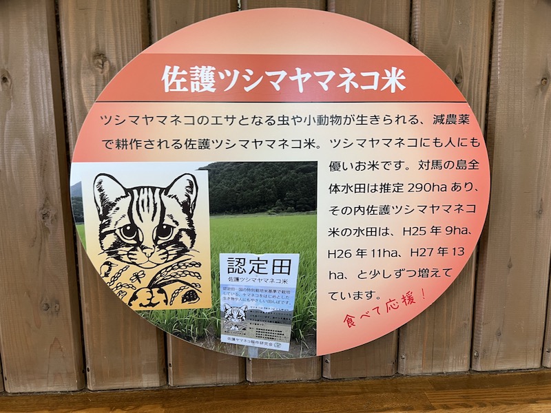 対馬ではヤマネコが生きる環境を守るために、ヤマネコのエサとなる虫やカエルなどが生息できるよう、減農薬の水田で「佐護(さご)ツシマヤマネコ米を耕作しています。ツシマヤマネコにも人にも優しいお米なのです。
