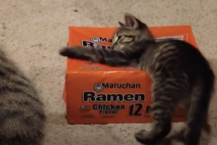 [ラーメン]と書かれた箱で遊んでいる子猫さん。 ちょうど穴が開いているので 中に入ろうとグイグイ手を入れたり 頭を突っ込んでみますが... うーん、なかなか中に入れない! 中にラーメンの袋でも詰まってるのかな? ...と思ったら、突然中からひょっこり... -