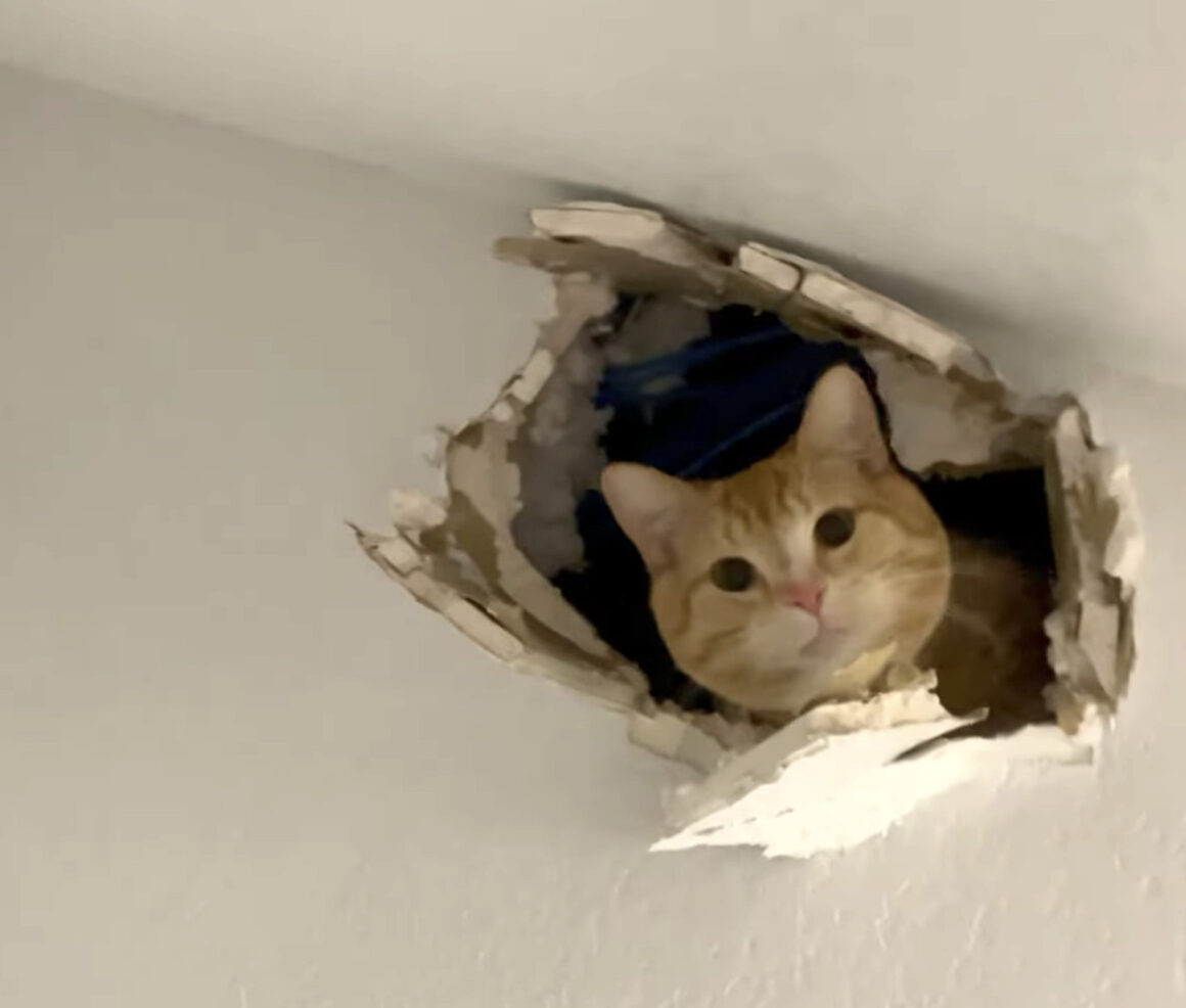 うっかり開けちゃった天井の穴に、猫は大喜び!