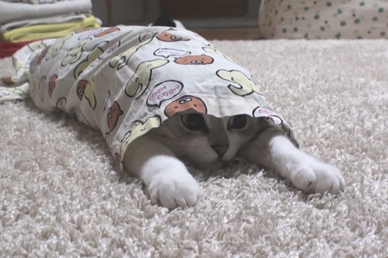 一部始終かわいい。笑 パジャマにハマったねこ、〇〇に釣られて….