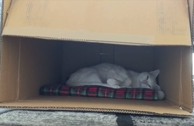 お気に入りのダンボールの中でとろ〜ん 眠たそうにしている猫さん。 飼い主さんが近くにきても、 ダンボールから出てきてくれない。 眠いみたいだし、無視してるし さすがにいらないかな?と思いつつ、 おやついる?と聞いて見たら… スクッ! のび〜! 「... -