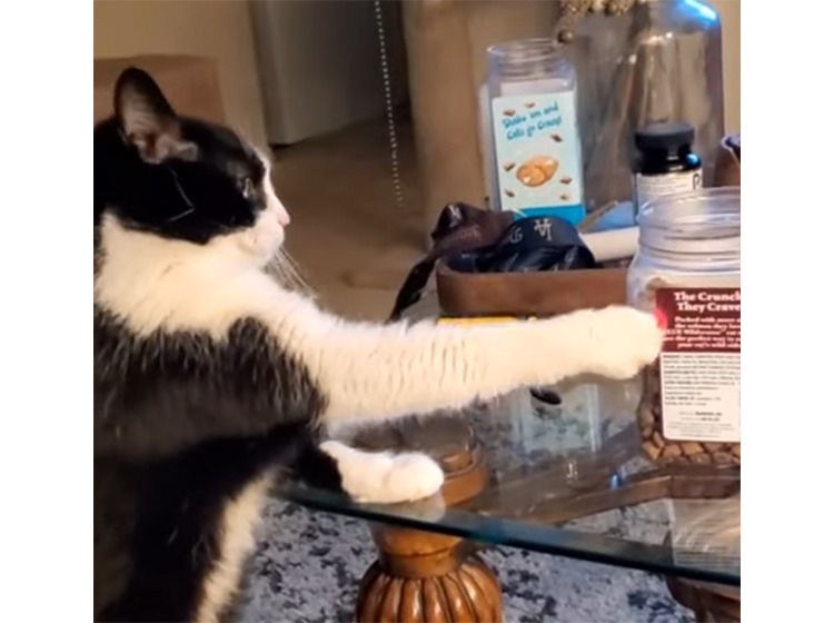 カリフォルニア州で暮らす猫さん。 飼い主さんが食べていたおやつが気になって テーブルに手を置き立ち上がっています。 勝手に盗み食いはせずに、 「これこれ、これが食べたいの!」と 指をさして飼い主さんにアピール! カメラを構える飼い主さんを チラ... -