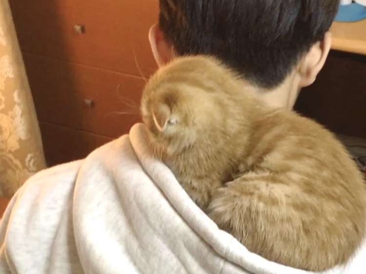飼い主さんの背中を探索していた猫、最高のお昼寝スポットを見つける。