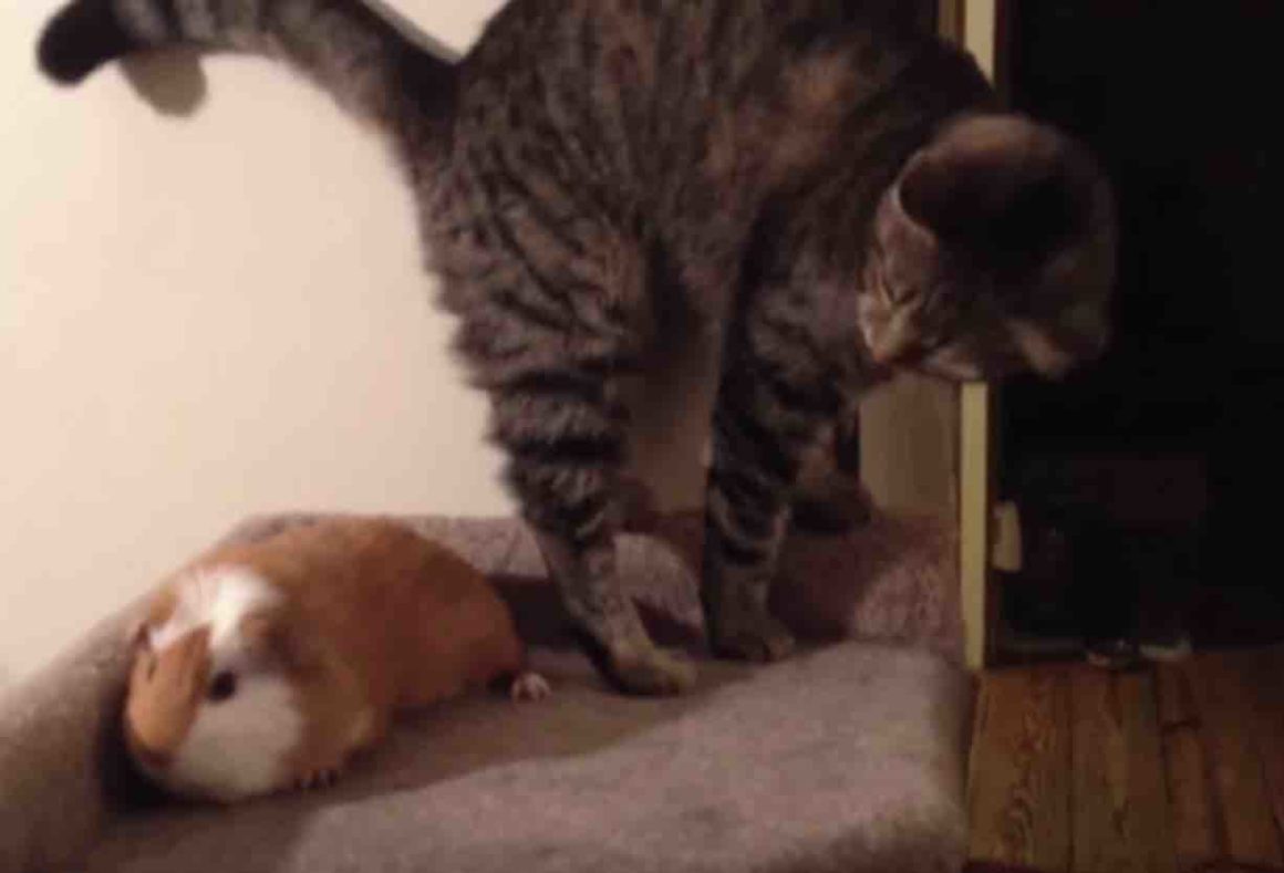 モルモットにお気に入りの場所をとられた猫さん。悔しさのあまり…