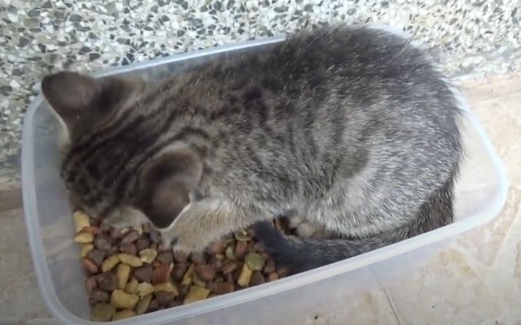 子猫だからできるご飯の食べ方!カリカリのベッドでご満悦♪