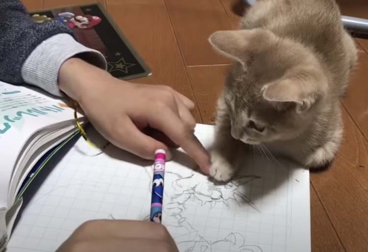 お絵かきをしている飼い主さん。 それを近くで眺めている子猫さんは、 しばらくじーっと絵を描いている姿を 見守っていたんだけど... だんだん我慢できなくなったのか、 鉛筆に向かって猫パンチ! もう完全に遊んでもらえると思ってる 可愛い妨害なのでし... -