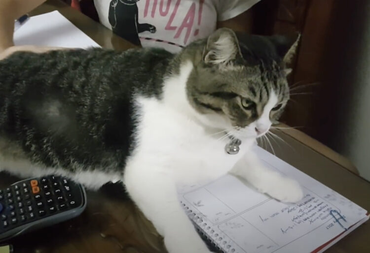 邪魔しニャいでよね!宿題の上でくつろぐ猫。退くように言われると逆ギレ(笑)