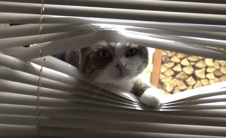 ブラインドの隙間からチラリ。昭和の刑事ドラマみたいなことをする猫さん