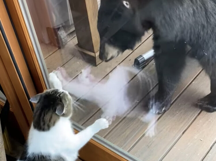 ナワバリに入るニャ! ポーチからクマを追い払う勇敢な猫!