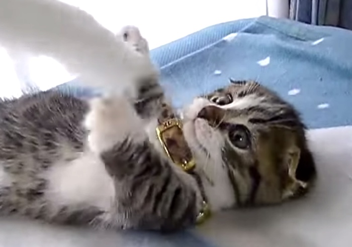短足でおなじみのマンチカンの子猫ちゃん。しかも耳折れ!もうかわいい... 飼い主さんにねこじゃらしで遊んでもらっていますが、なかなか捕まりません。 本気を出すぞ〜〜と、必殺超高速ねこパンチを繰り出すと...! ほぼ、届きませんでした!劇的にかわい...