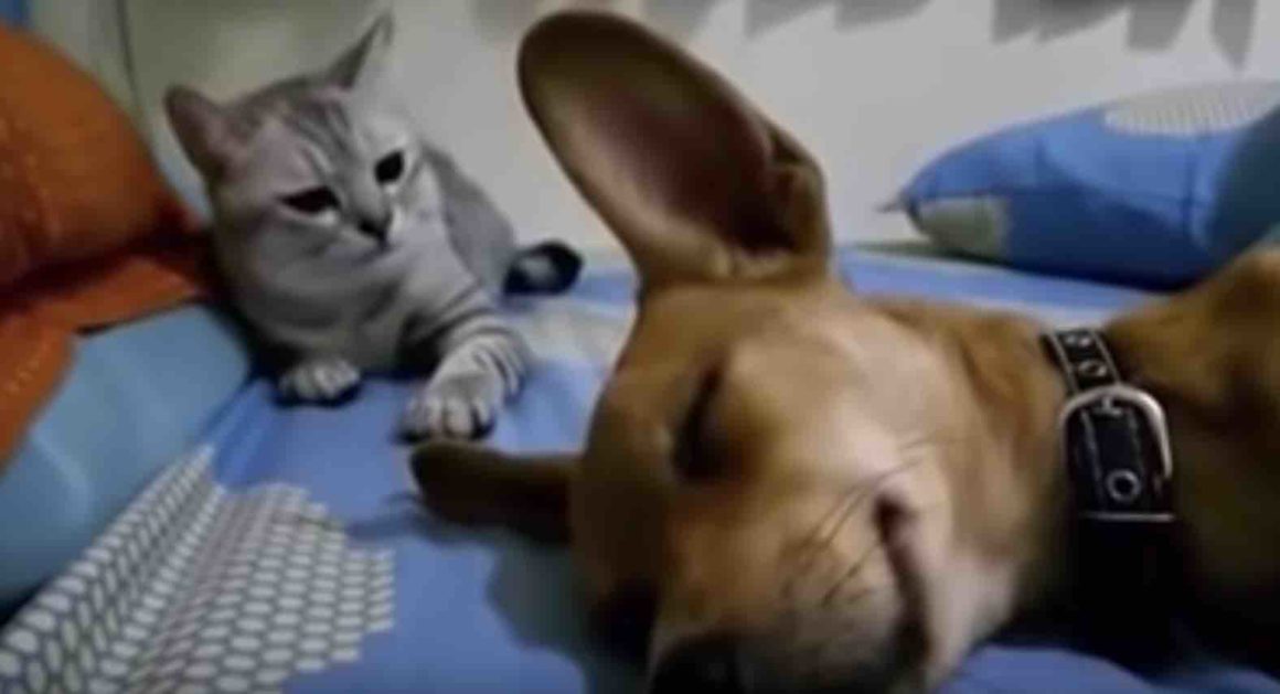 猫「なにしてるんだよ〜!」眠っている犬に怒って猫パンチ。