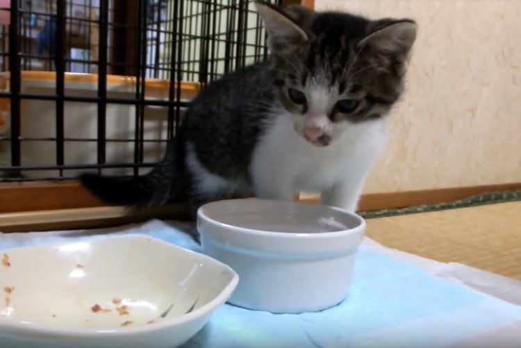初々しすぎて可愛い♪ お皿から水を飲んでみる子猫。