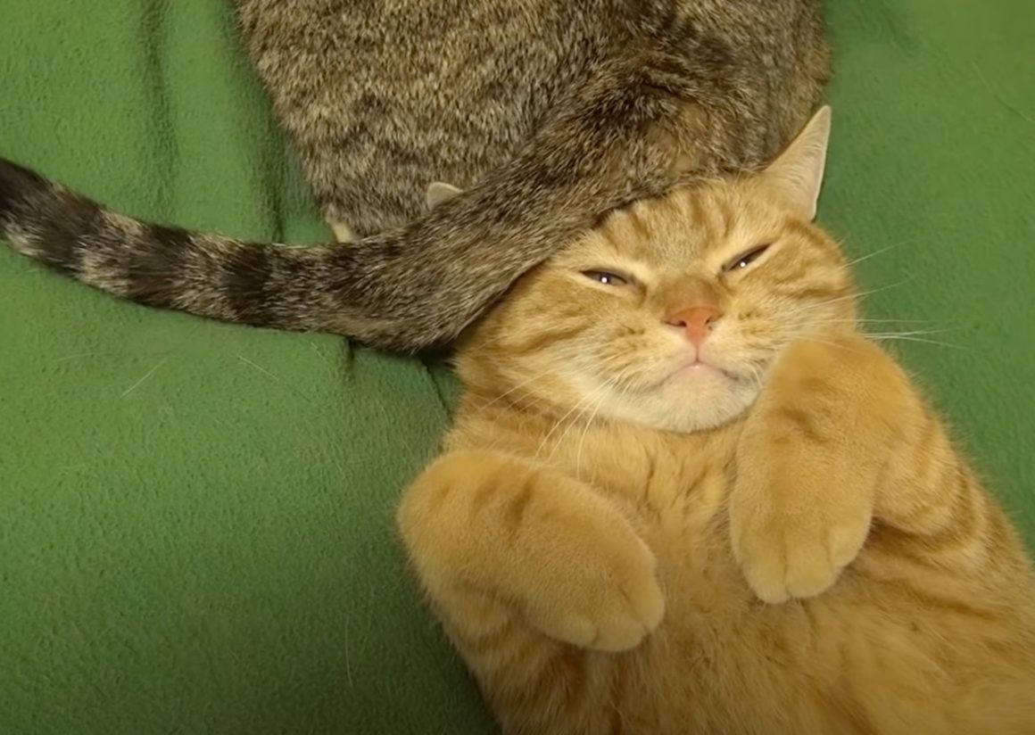 お昼寝しようかな〜と、 仰向けになっている茶トラ猫さん。 仰向けになっているのは、リラックスしている証拠! これから気持ちよく眠りに落ちるところでしたが... 頭の真上でパタパタと動くしっぽが! 顔に巻き付いてきた尻尾を、 猫「顔に当たってるから...