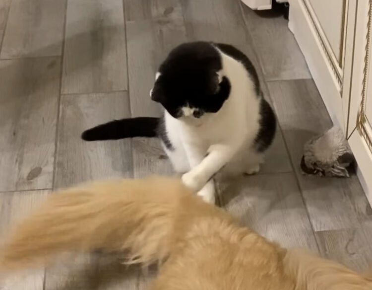 おっきい猫じゃらしだ〜♪ 犬の尻尾で遊ぶ猫ちゃん。