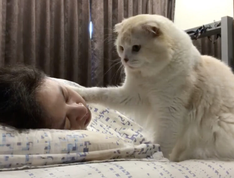 猫「寝てるの?ねぇねぇ〜」飼い主の顔をペシペシッ!