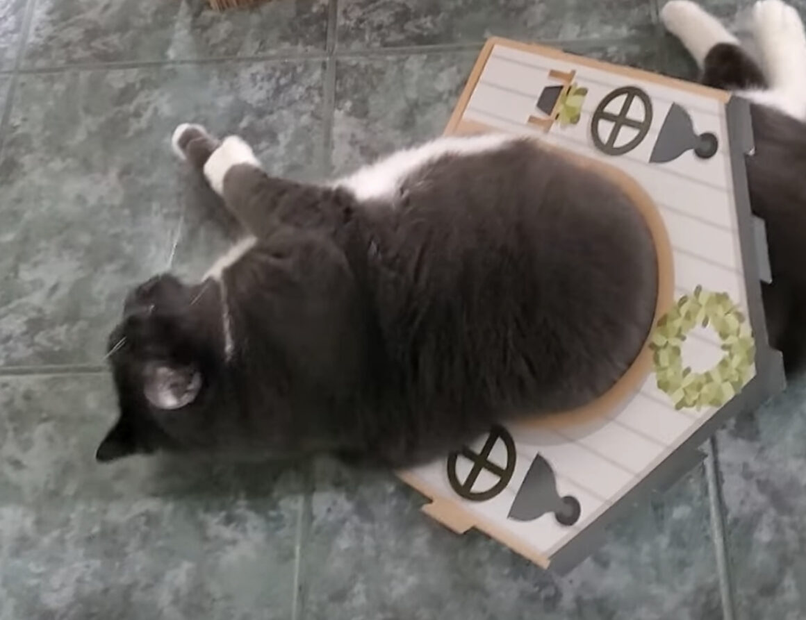 せっかく素敵なお家をもらったのに! ぽっちゃり猫さん、ドアに阻まれる。