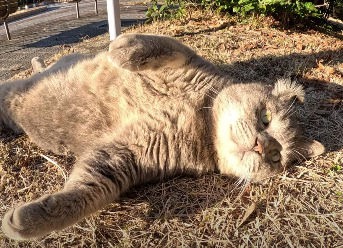 ふくよかなボディの猫さん。 一般的な猫さんと比べると かなりお尻が大きい! 動いたりするのに色々不便そうだけど、 この通り、後ろ足の毛繕いも出来るくらい 体はとっても柔らかいのです。 しかし、背中をスリスリと床に 擦り付けようと横になると... 猫...