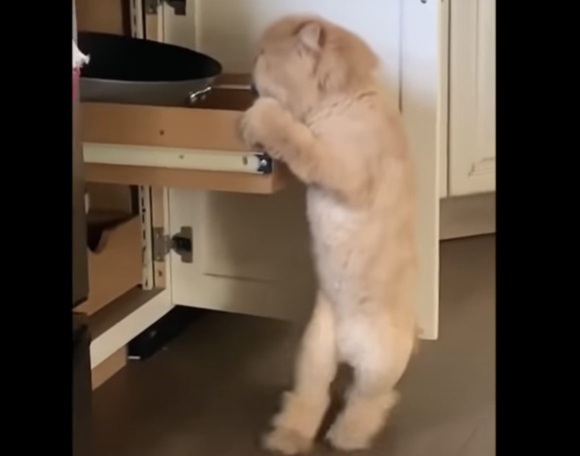おやつが欲しくて引き出しを開ける猫、捜索の仕方が面白い。