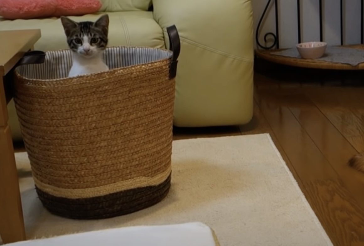 バスケットに隠れてこっそり…柴犬に迫る猫。