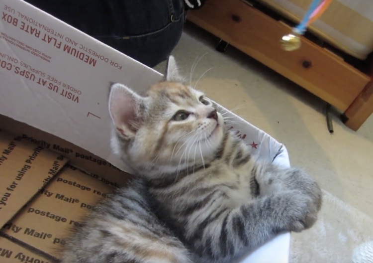 箱の中にいる子猫に、鈴のおもちゃで催眠術をかけてみました。 催眠術といっても、目の前で鈴をゆらゆら揺らすだけ。 鈴を見つめていた子猫はしだいに眠くなったように... こくり、こくり。最後にハッ!とするリアクション、100点です。 完全に術にハマっ... -