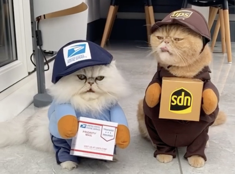 「荷物のお届けで〜す!」可愛い猫の配達員さん。
