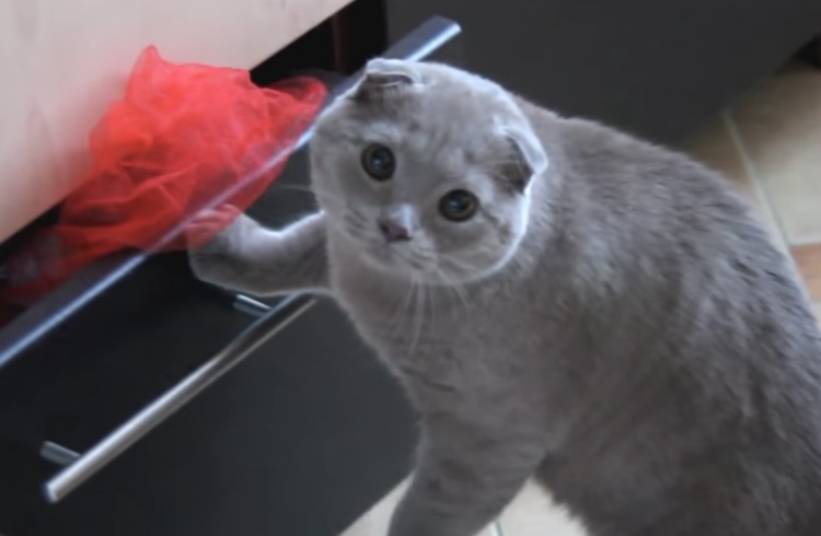 引き出しを物色中のねこさん。 お気に入りのおやつ、はたまたおもちゃを探している彼。ふと、後ろをふりむくと。 そこにはカメラを回している飼い主さんの姿が。 静かに驚いた猫さん、目線はこちらのまま、そっと戸棚を閉める姿がシュールすぎます。 -