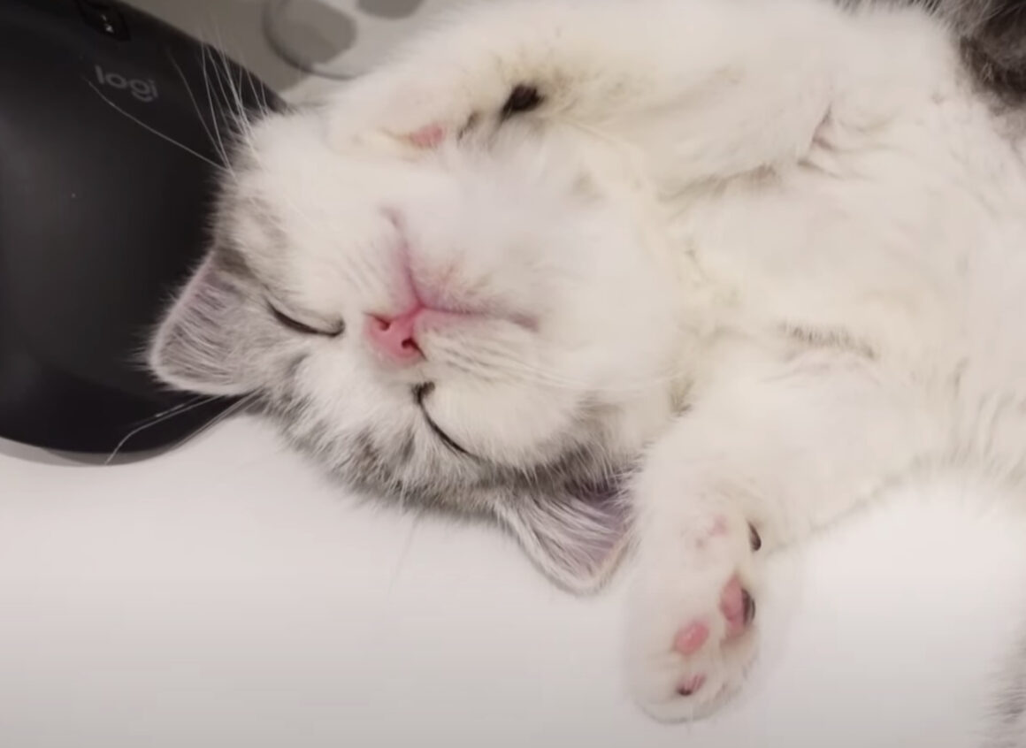 ここのほうがお昼寝が捗るにゃ!デスクで無防備に寝る子猫さん。