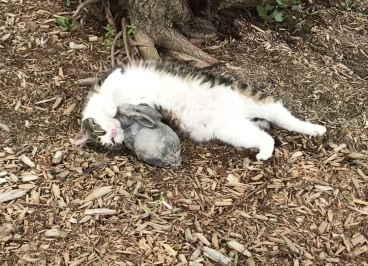 こちらはアメリカに住んでいるメス猫のジョジョさん。 お庭で何やら嬉しそうに ごろごろ転がりながらお腹を見せて 甘えるようなポーズをしています。 よく見ると猫さんは両手に、 何かを大事そうに抱えています。 カメラが寄ってみると?? それはうさぎさ... -