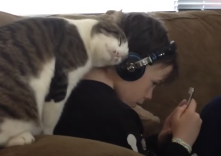 一般的に、自由気ままで 撫でたい時に撫でさせてくれずに 甘えたい時にだけやってくる猫さん。 そういう自由な性格が猫の魅力ですが 中にはこんなに甘えん坊の子もいるようで... ヘッドフォンをつけて、 音楽を聞いている男の子。 手にはスマホをもち、猫...