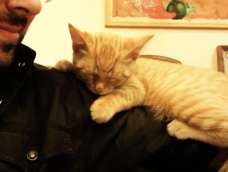最高に可愛い! 肩の上でリラックスして寝る子猫。