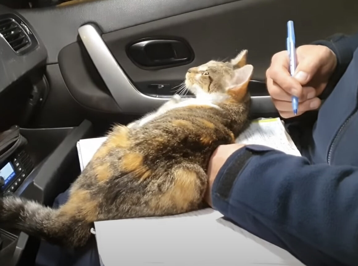 迷子の猫さん、こっそりパトカーに侵入してゴロゴロ!