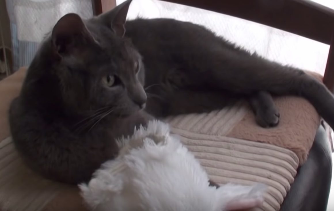 椅子でくつろいでる猫さん。 手元にあるウサギの帽子を、 よいしょ、よいしょと被りだした!? あっという間に被り終えて、「どぉ?」と飼い主さんを見上げてます。 自分で帽子をかぶるなんて、すごい! ...と思ったら、実はこの動画にはタネが。 脱いでる... -