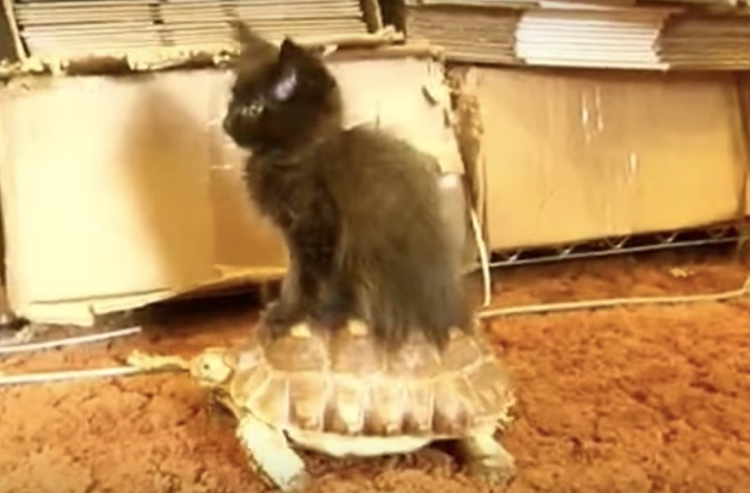 カメラの前を横切るのは、亀...に乗った黒猫の子猫さん。 どうでしょうか、どこか得意げな顔をしているようにみえますよね。笑 多分、いや確実に歩いた方がはやいのですが、優雅なタートルドライブを楽しむ子猫さんでした。