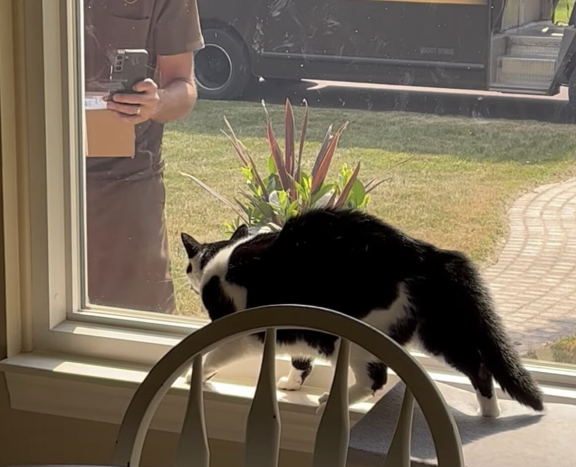 窓から外を眺めている猫さん。 鳥の声や動く物を観察して ニャルソックしていたようです。 そこへ、車が止まって配達員さんが。 荷物を届けにきてくれました! その姿を見た猫さんは、 ガラス越しに敵意剥き出し!! 配達員さんに、思いっきり えいっ!!... -