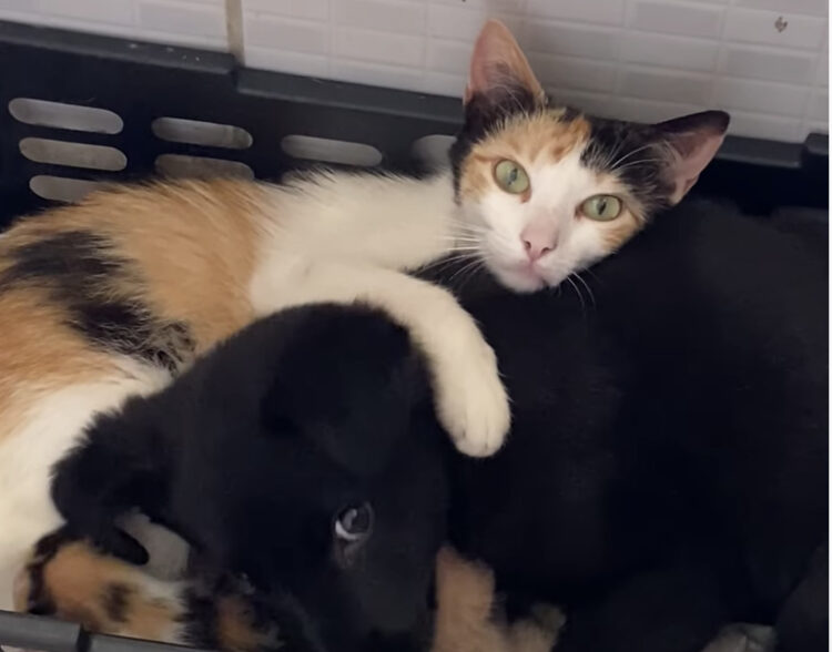 子猫を抱きしめる子犬と、その子犬を抱きしめる母猫の姿にほっこり♪