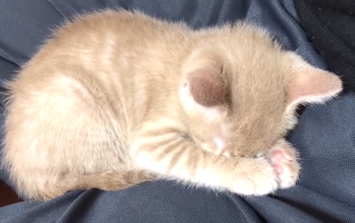 飼い主さんの膝の上で遊んでいる子猫。 ひととおり遊び終えて、手をハムハムしだしたと思ったら... まるくなってスヤァ。気持ちよくて寝ちゃったんですね。一部始終が膝の上っていうところも最高です。