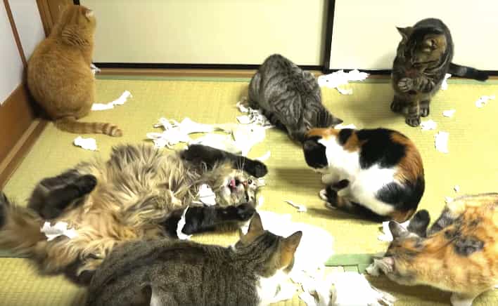 嘘でしょう〜…!!猫の「トイレットペーパーパーティ」開催。