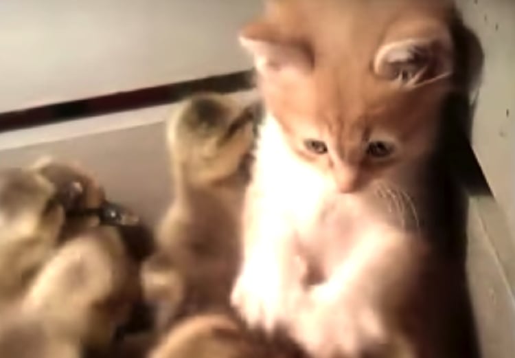 なんにゃ?!大量の雛に囲まれてアワアワする子猫。