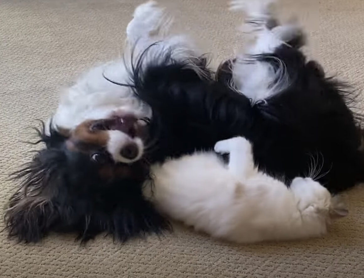 やだ、可愛いしか言葉が浮かばない! へそ天対決して遊ぶ子猫と犬さん。