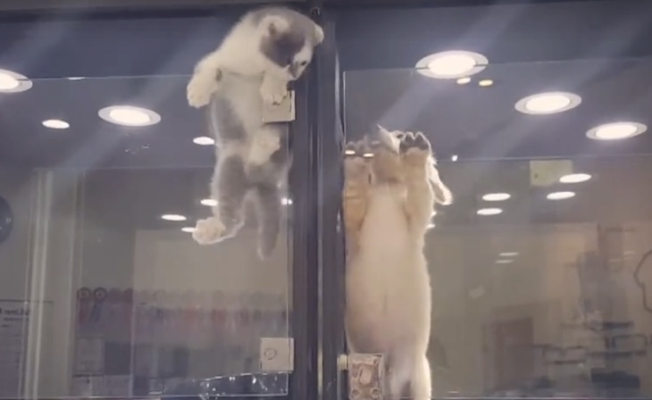 ペットショップのケージで、子猫と子犬が隣同士に。 ちょっぴり寂しそうな子犬をみた子猫は、よいしょっとケージを登り... 無事(?)に、子犬のケージに到着。子犬さん、なんだか嬉しそうです。
